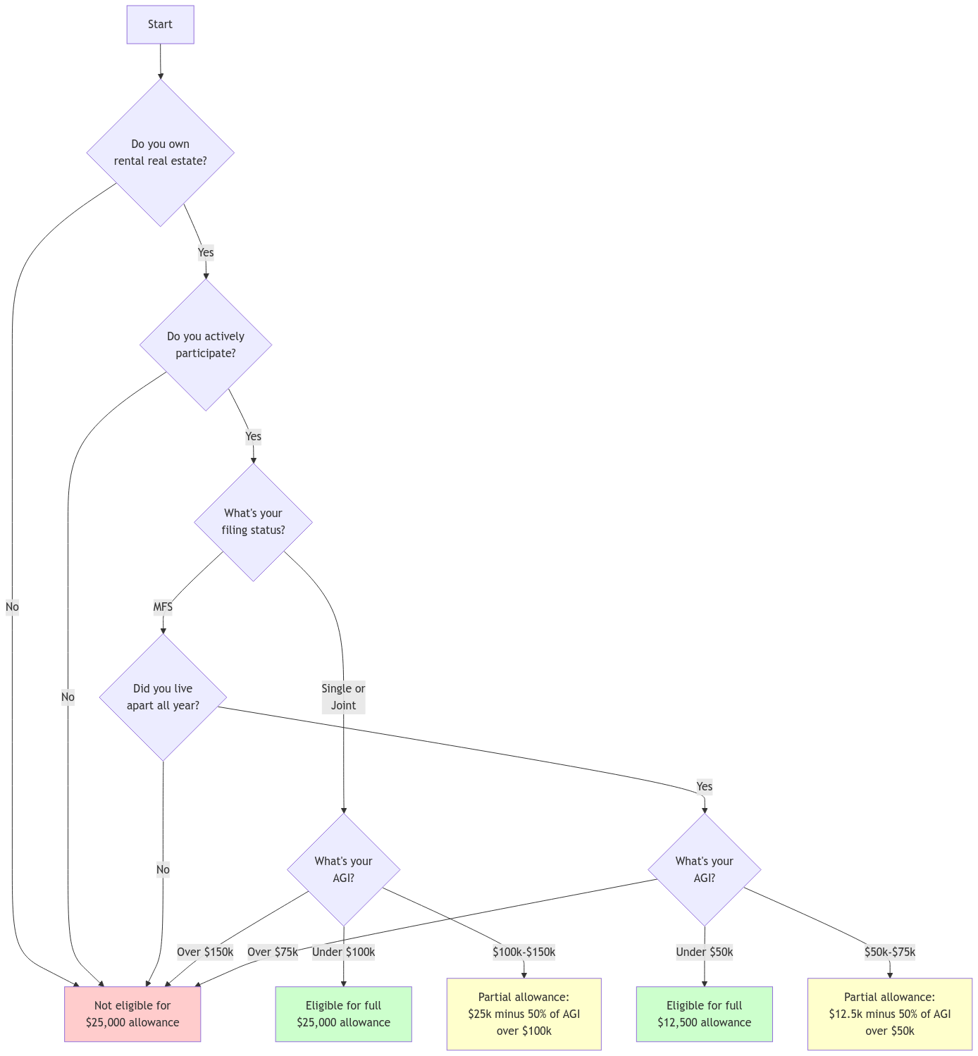 If you qualify, you can deduct up to $25,000 in passive losses against your other income. However, this is subject to a phase-out between $100,000 and $150,000 of adjusted gross income (AGI). For every dollar your AGI exceeds $100,000, the $25,000 allowance is reduced by 50 cents. This means the deduction is completely phased out at $150,000 AGI.