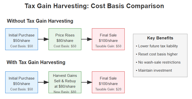 Your cost basis is essentially what you originally paid for an asset. When you sell an asset for more than its cost basis, you realize a capital gain and may owe taxes. By harvesting gains, you increase your cost basis to the current market price, reducing your future tax liability when you eventually sell the asset.